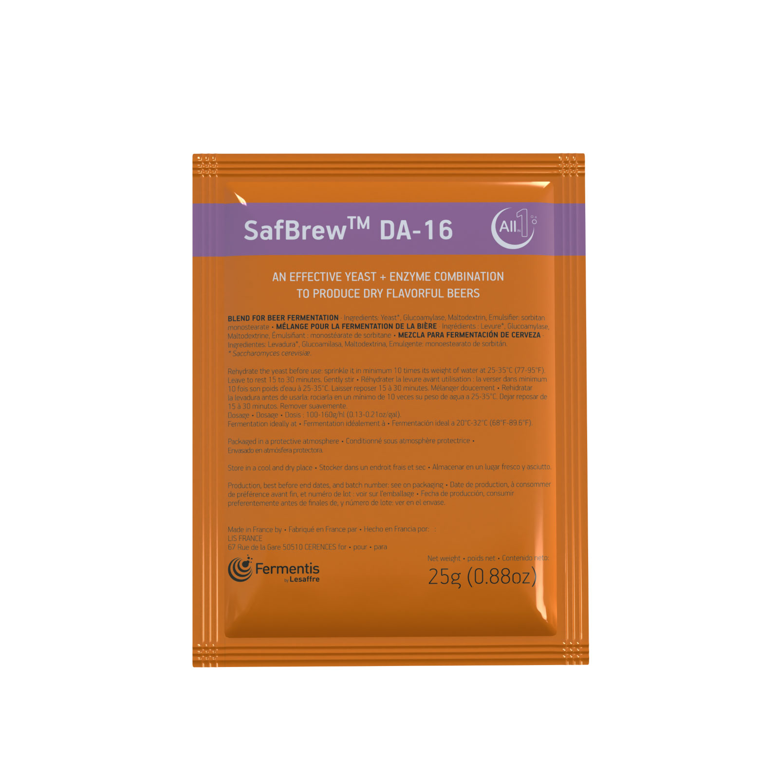 SafBrew™ DA-16 is the perfect choice (consisting of Active Dry Yeast and enzymes) for the production of very dry flavorful beers, particularly fruity and hoppy ones like dry versions of IPAs. Could also be suitable for some versions of Imperial IPAs. Indeed, SafBrew™ DA-16 is also recommended for very high gravity wort, allowing a level of alcohol up to 16% ABV.