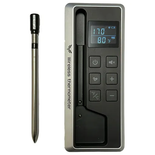 Our Wireless Digital Thermometer includes a rechargeable probe and base, which both charges the probe and displays the temperature. The base has a magnetic back so you can place it on a refrigerator or other metal object nearby. The thermometer also connects to an app on your phone, make it extremely convenient. Display in either Fahrenheit or Celsius, and set alarms so that you are notified when there is a change in temperature.